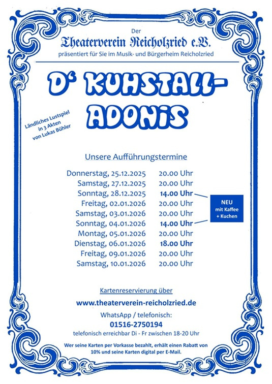 An 10 Tagen möchten wir euch mit unserem neuen Stück "D'Kuhstall-Adonis" von Lukas Bühler ein paar Stunden mit viel Freude und Geselligkeit, abseits vom Alltagsstress bieten.